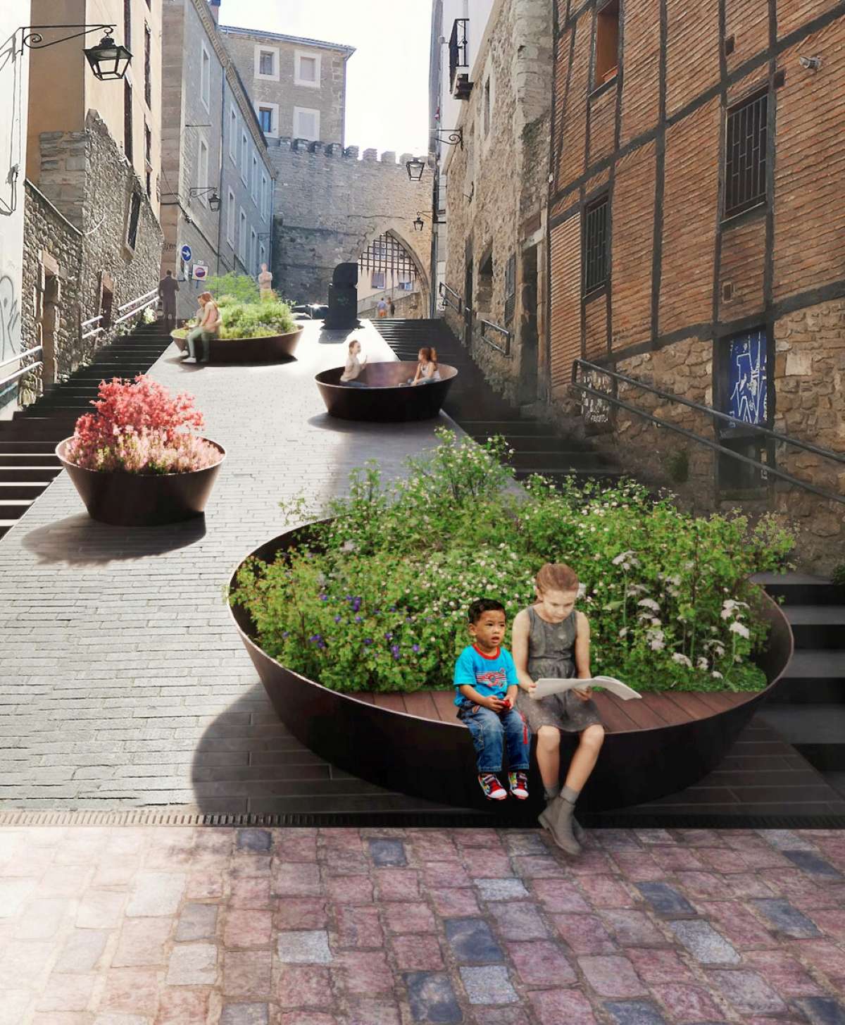 El proyecto introduce el concepto de los “Kaikus”, grandes jardineras circulares de acero y madera que combinarán vegetación, bancos y plataformas, adaptándose a las pendientes de los cantones. Estas piezas servirán como micro islas verdes que aportarán frescor, sombra y biodiversidad, con plantas de bajo mantenimiento y escasa necesidad de riego.